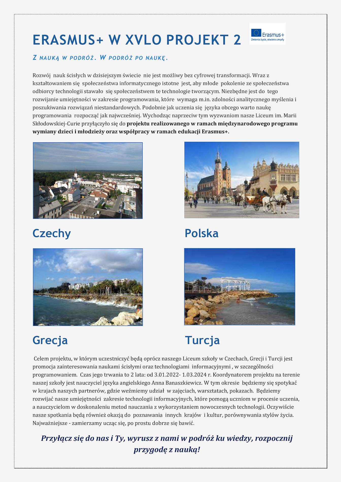 Celem projektu, w którym uczestniczyć będą oprócz naszego Liceum szkoły w Czechach, Grecji i Turcji jest promocja zainteresowania naukami ścisłymi oraz technologiami informacyjnymi , w szczególności programowaniem. Czas jego trwania to 2 lata: od 3.01.2022- 1.03.2024 r. Koordynatorem projektu na terenie naszej szkoły jest nauczyciel języka angielskiego Anna Banaszkiewicz. W tym okresie będziemy się spotykać w krajach naszych partnerów, gdzie weźmiemy udział w zajęciach, warsztatach, pokazach. Będziemy rozwijać nasze umiejętności zakresie technologii informacyjnych, które pomogą uczniom w procesie uczenia, a nauczycielom w doskonaleniu metod nauczania z wykorzystaniem nowoczesnych technologii. Oczywiście nasze spotkania będą również okazją do poznawania innych krajów i kultur, porównywania stylów życia. Najważniejsze - zamierzamy ucząc się, po prostu dobrze się bawić.