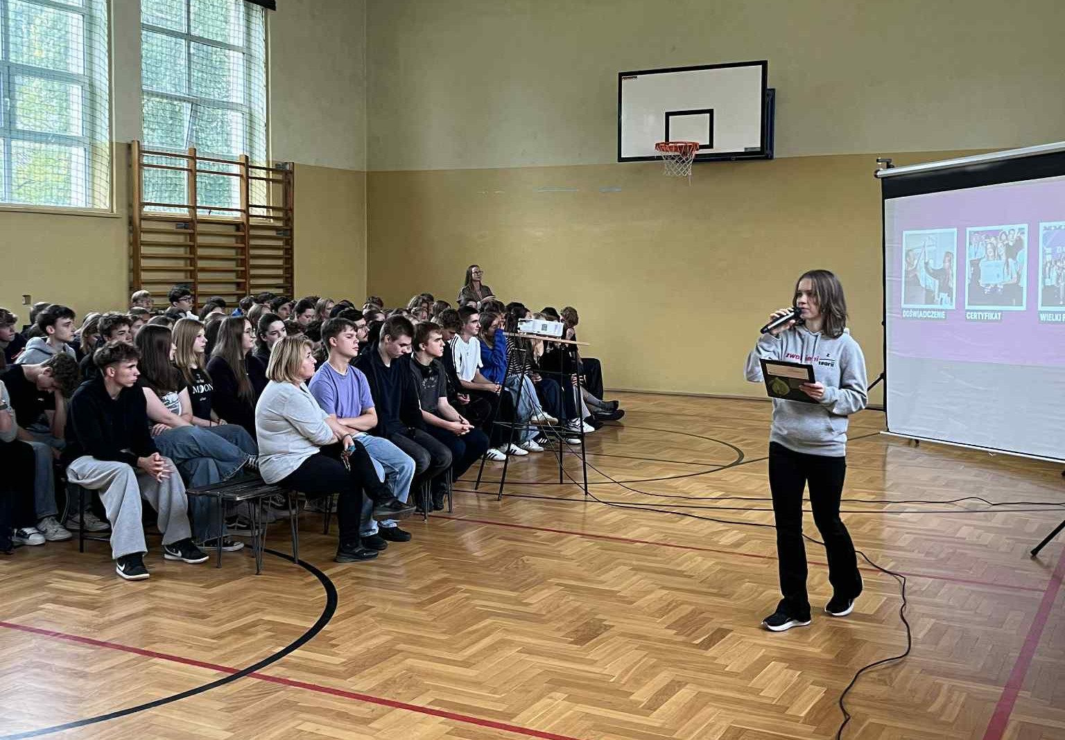 Na sali gimnastycznej Kasia, ambasadorka, opowiadała i zachęcała do tworzenia projektów uczniów klas