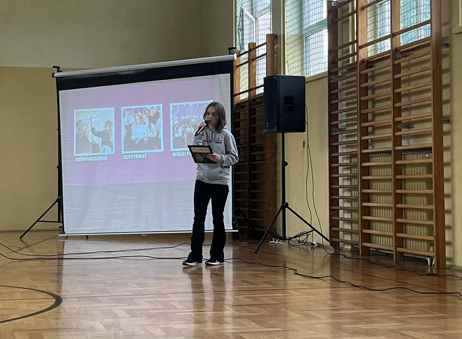 Na sali gimnastycznej Kasia, ambasadorka, opowiadała i zachęcała do tworzenia projektów uczniów klas